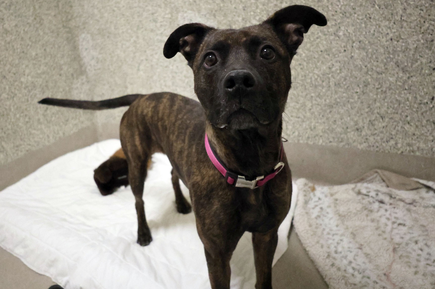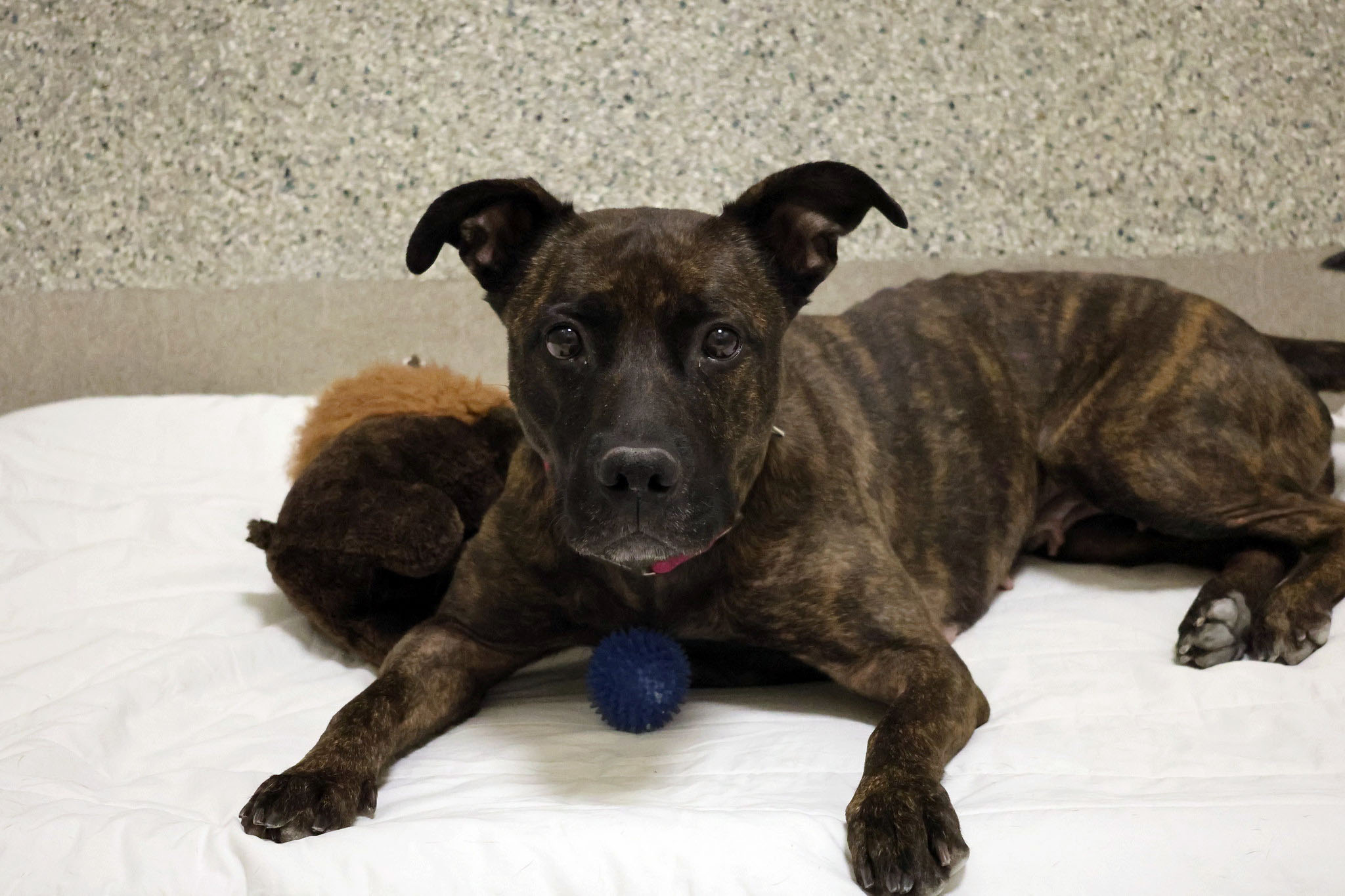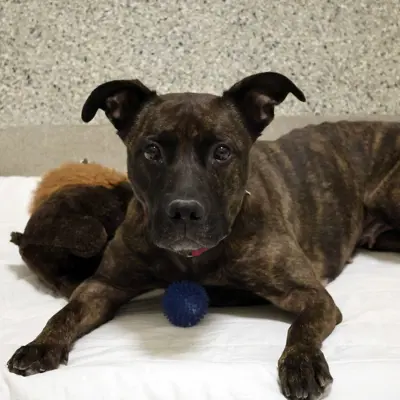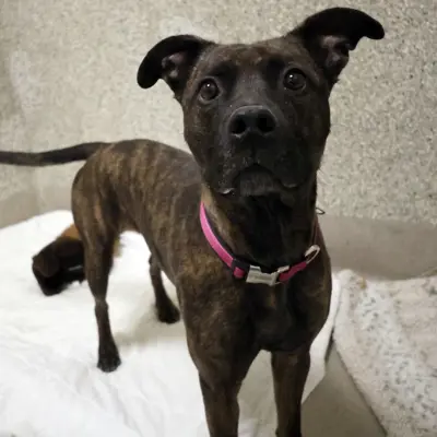 I'm a retriever mix with a beautiful brown brindle short coat.