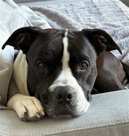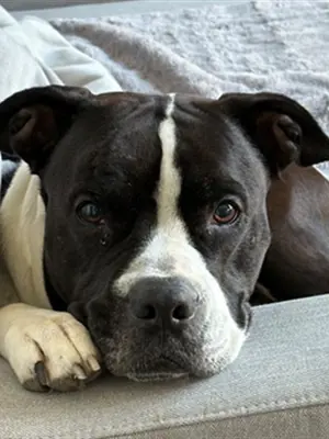 I'm a bulldog mix with a short black and white coat.