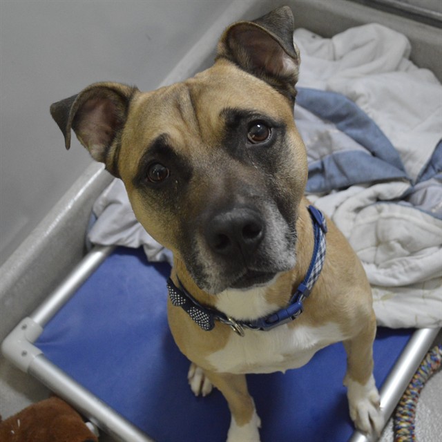 I'm an American bulldog mix with a beautiful short fawn and white coat.