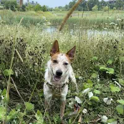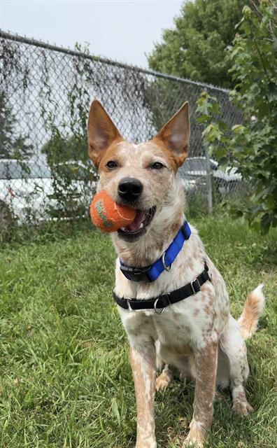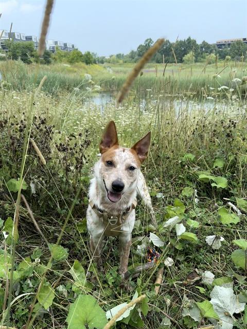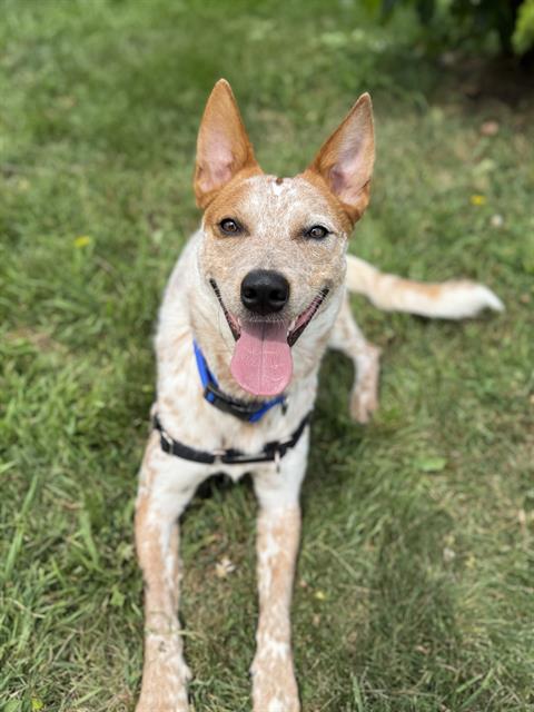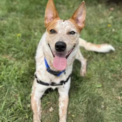 I'm an Australian cattle dog with a short red-ticked coat.